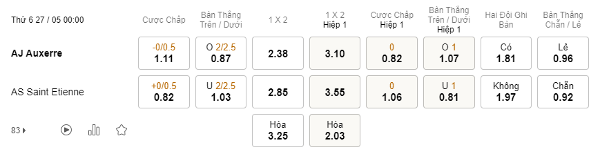 Tỉ lệ kèo Auxerre vs Saint Etienne