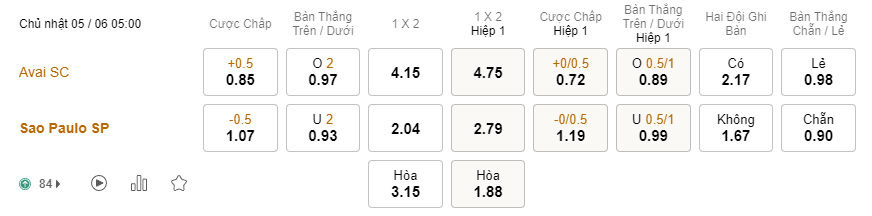 Soi kèo hiệp 1 Avai vs Sao Paulo: 0.72*0/0.5*1.19