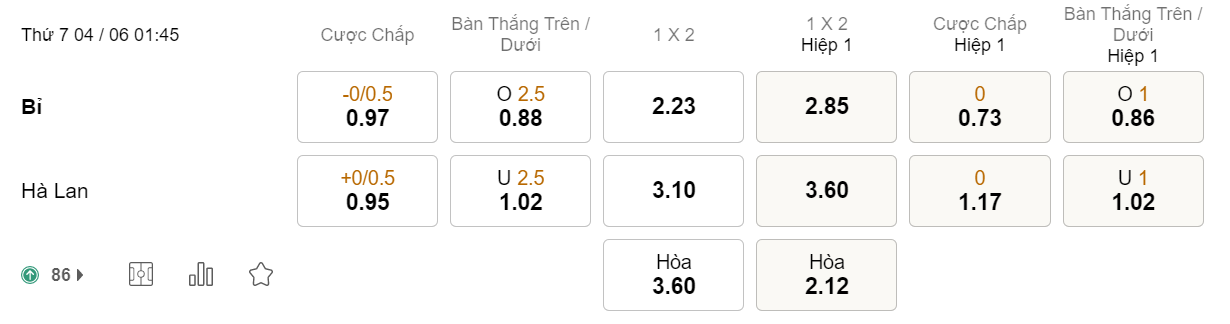 Tỉ lệ kèo Bỉ vs Hà Lan