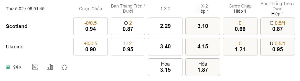 Soi kèo châu Á Scotland vs Ukraine: 0.94*0/0.5*0.90