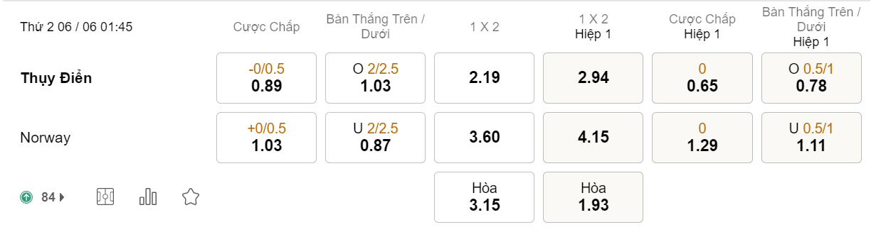 Tỉ lệ kèo Thụy Điển vs Na Uy